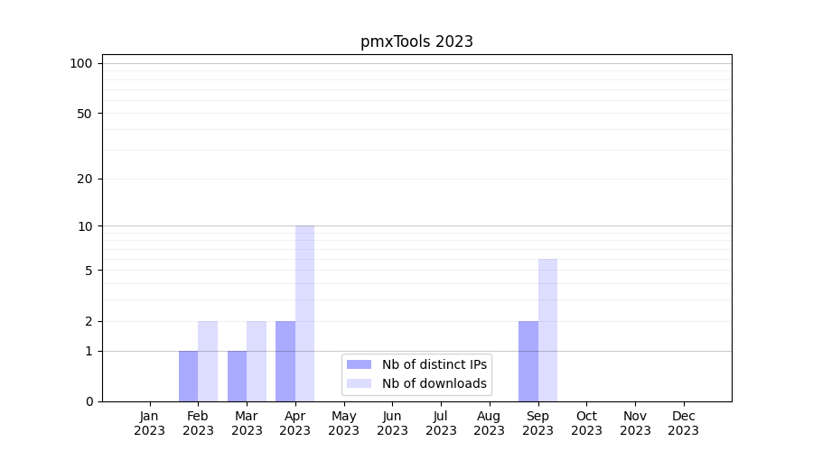 Number of downloads for annotation package pmxTools, year by year, from 2025 back to 2014 (years with no downloads are omitted):