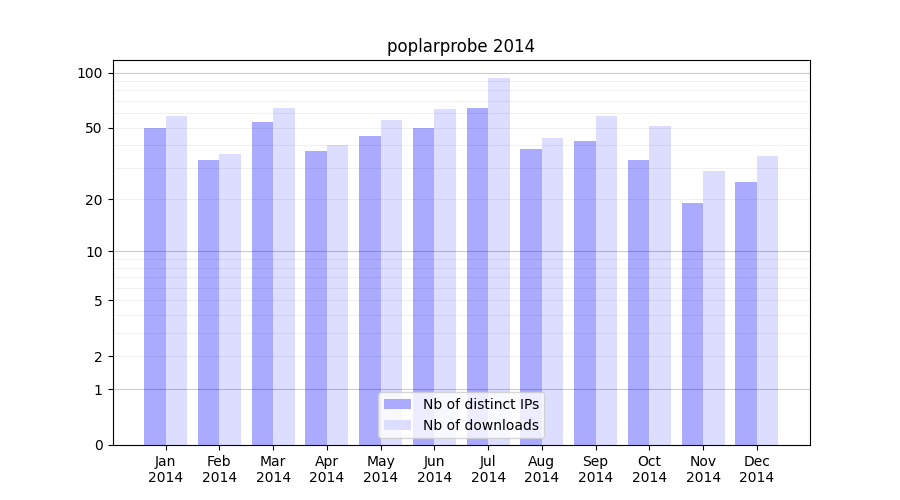 Number of downloads for annotation package poplarprobe, year by year, from 2025 back to 2014 (years with no downloads are omitted):