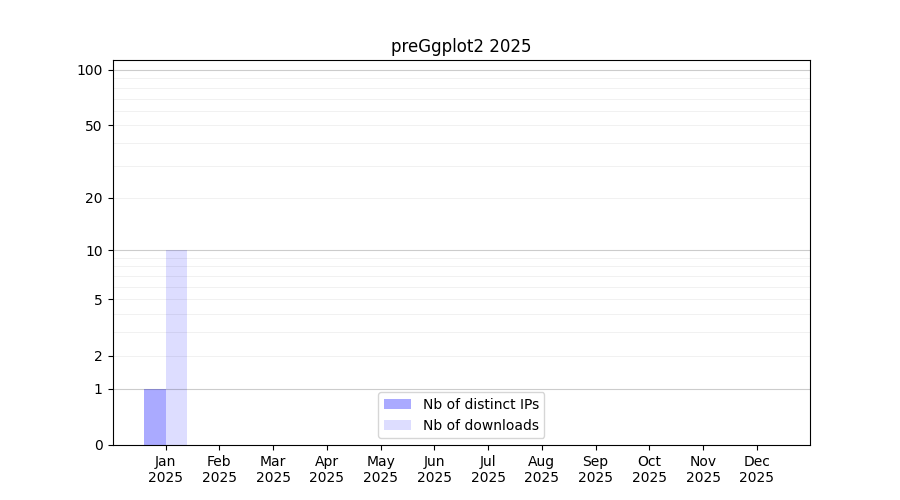Number of downloads for annotation package preGgplot2, year by year, from 2025 back to 2014 (years with no downloads are omitted):