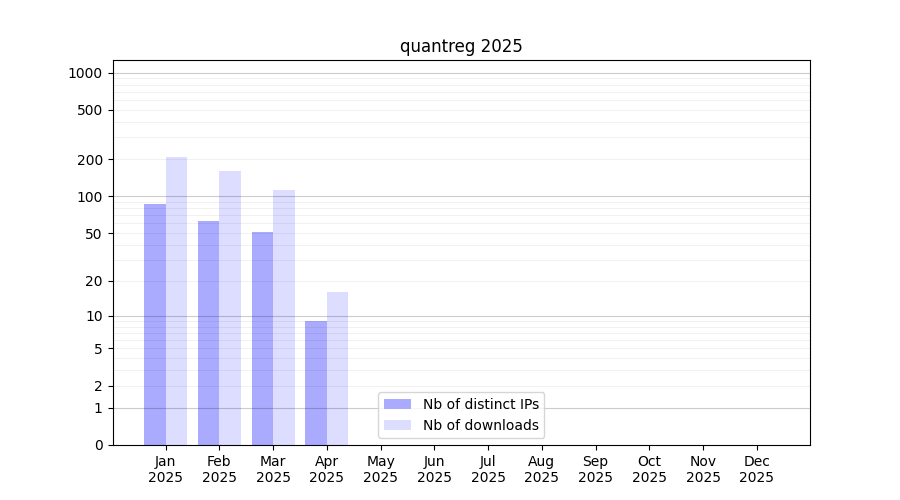 Number of downloads for annotation package quantreg, year by year, from 2025 back to 2014 (years with no downloads are omitted):