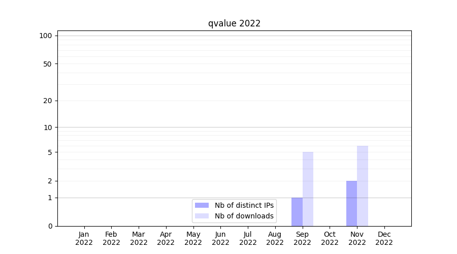 Number of downloads for annotation package qvalue, year by year, from 2025 back to 2014 (years with no downloads are omitted):