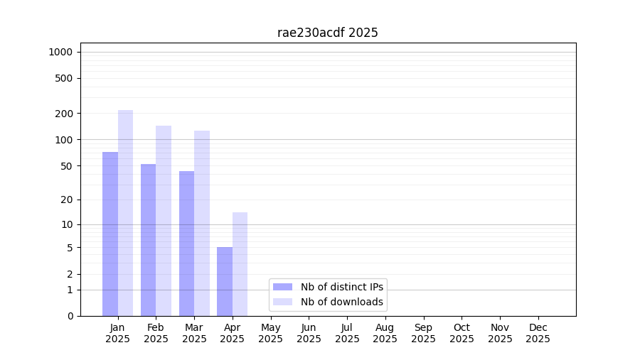 Number of downloads for annotation package rae230acdf, year by year, from 2025 back to 2014 (years with no downloads are omitted):