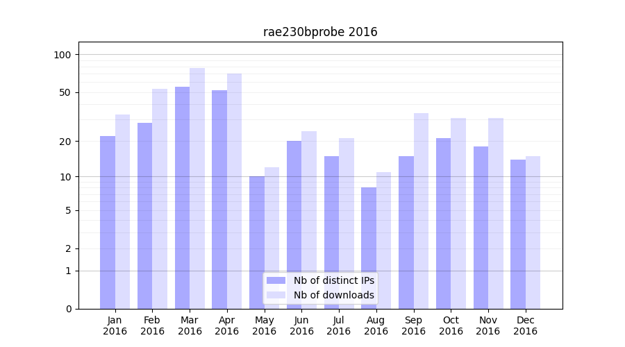 Number of downloads for annotation package rae230bprobe, year by year, from 2025 back to 2014 (years with no downloads are omitted):