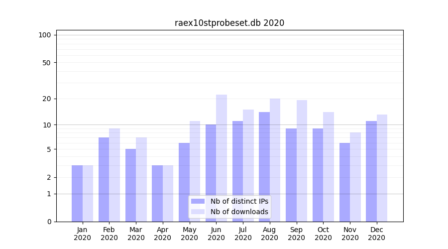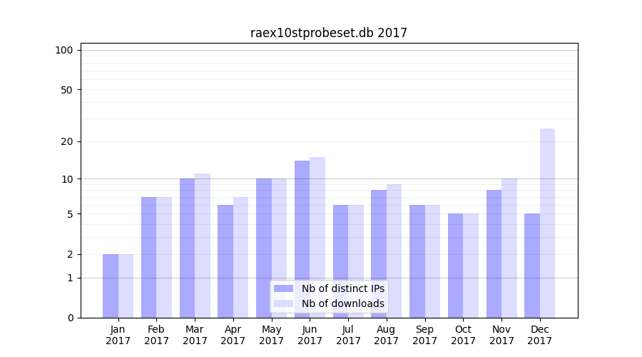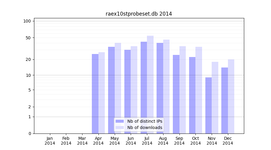Number of downloads for annotation package raex10stprobeset.db, year by year, from 2025 back to 2014 (years with no downloads are omitted):