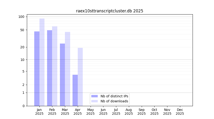 Number of downloads for annotation package raex10sttranscriptcluster.db, year by year, from 2025 back to 2014 (years with no downloads are omitted):