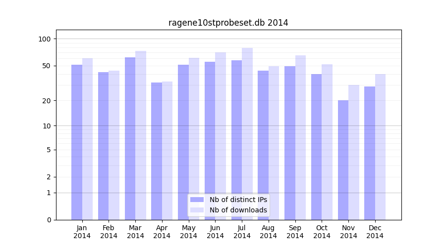 Number of downloads for annotation package ragene10stprobeset.db, year by year, from 2025 back to 2014 (years with no downloads are omitted):