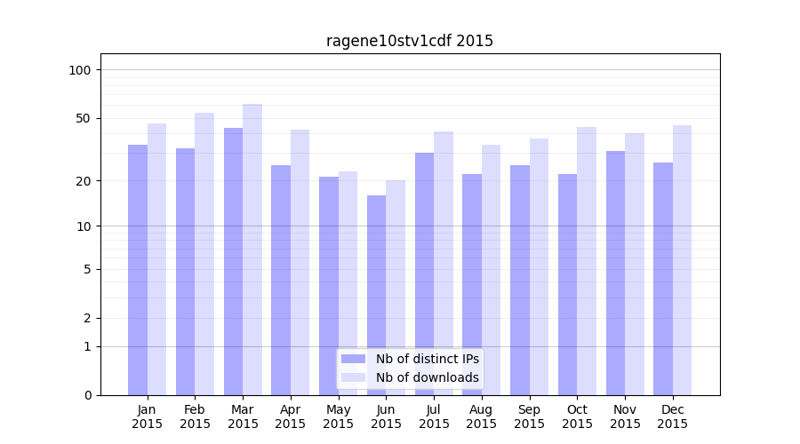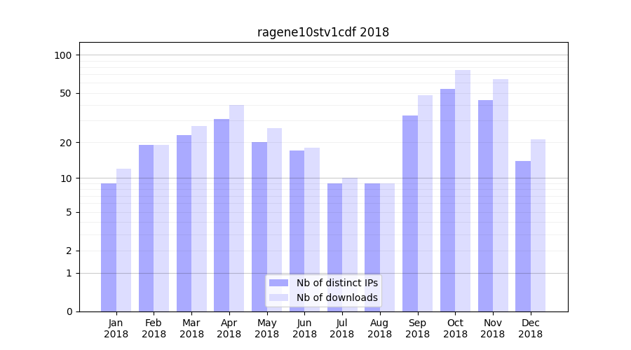Number of downloads for annotation package ragene10stv1cdf, year by year, from 2025 back to 2014 (years with no downloads are omitted):