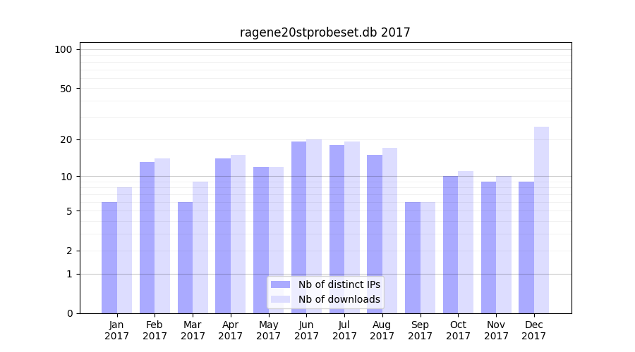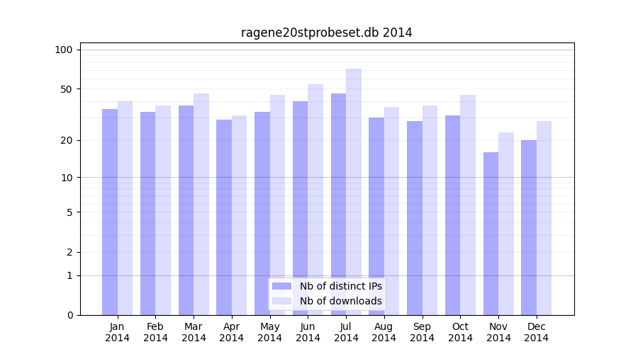 Number of downloads for annotation package ragene20stprobeset.db, year by year, from 2025 back to 2014 (years with no downloads are omitted):