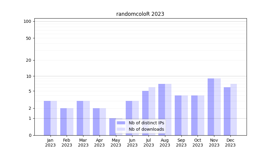 Number of downloads for annotation package randomcoloR, year by year, from 2025 back to 2014 (years with no downloads are omitted):