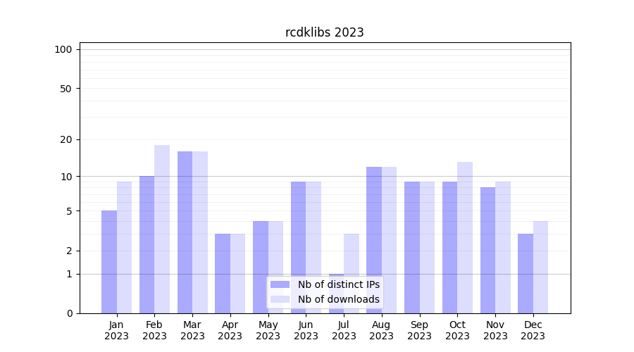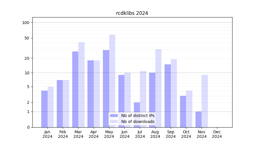 Number of downloads for annotation package rcdklibs, year by year, from 2025 back to 2014 (years with no downloads are omitted):