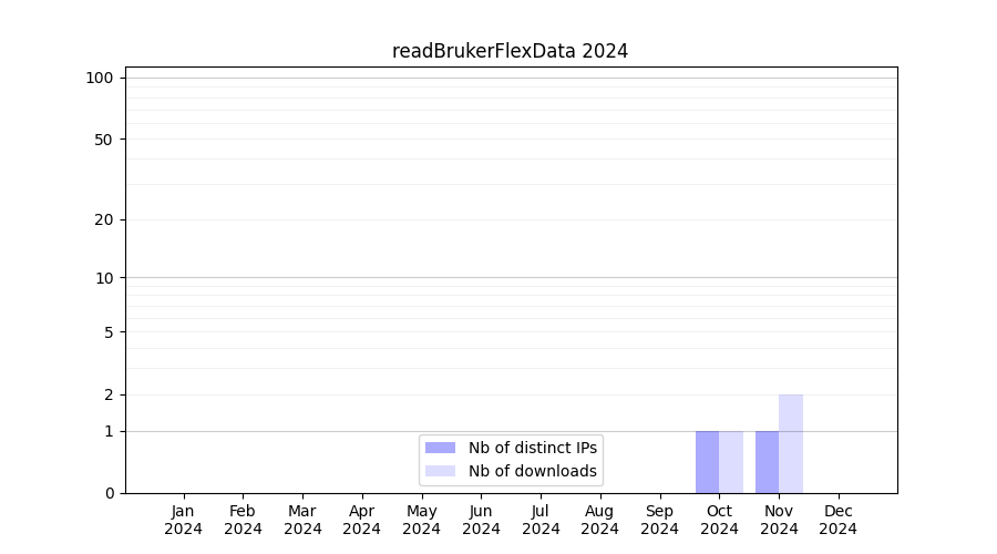 Number of downloads for annotation package readBrukerFlexData, year by year, from 2025 back to 2014 (years with no downloads are omitted):