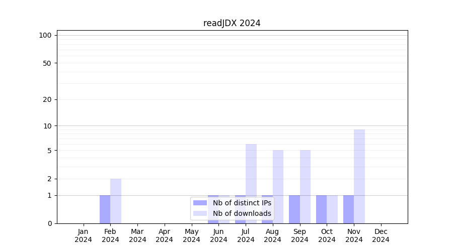 Number of downloads for annotation package readJDX, year by year, from 2025 back to 2014 (years with no downloads are omitted):