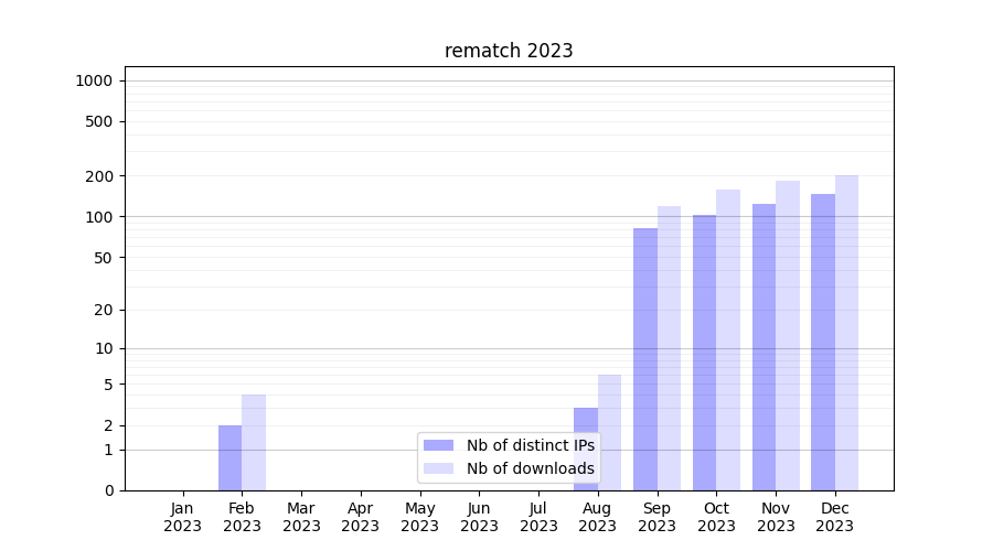 Number of downloads for annotation package rematch, year by year, from 2025 back to 2014 (years with no downloads are omitted):