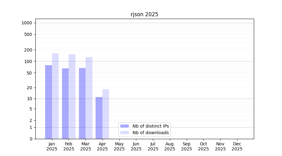 Number of downloads for annotation package rjson, year by year, from 2025 back to 2014 (years with no downloads are omitted):