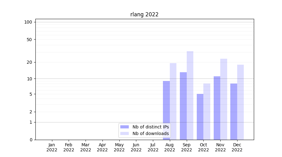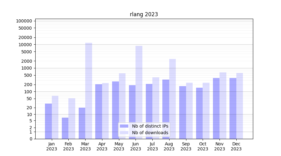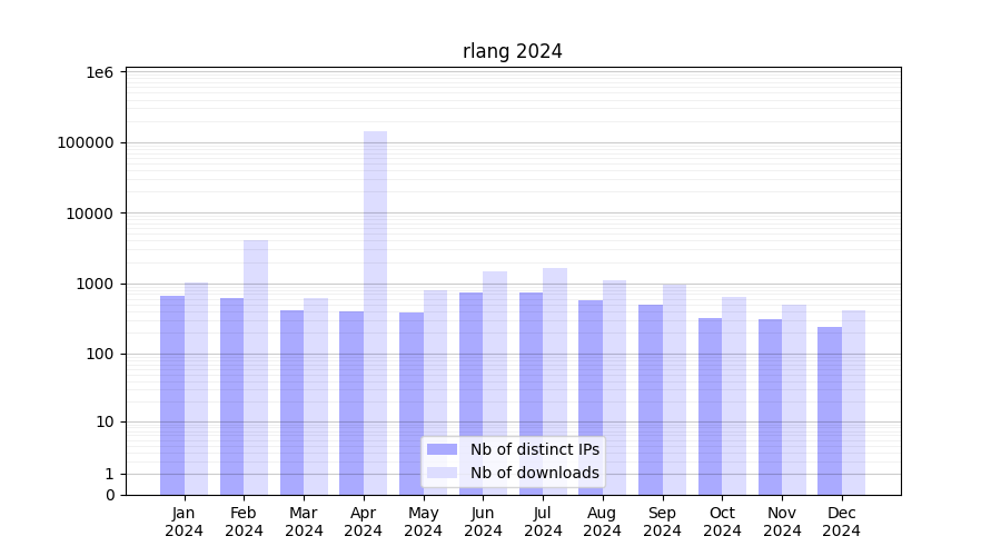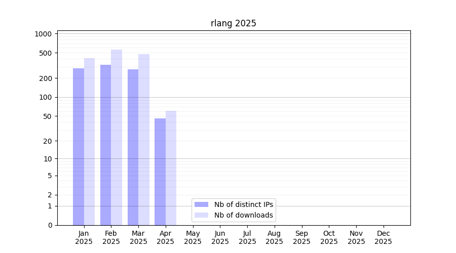 Number of downloads for annotation package rlang, year by year, from 2025 back to 2014 (years with no downloads are omitted):