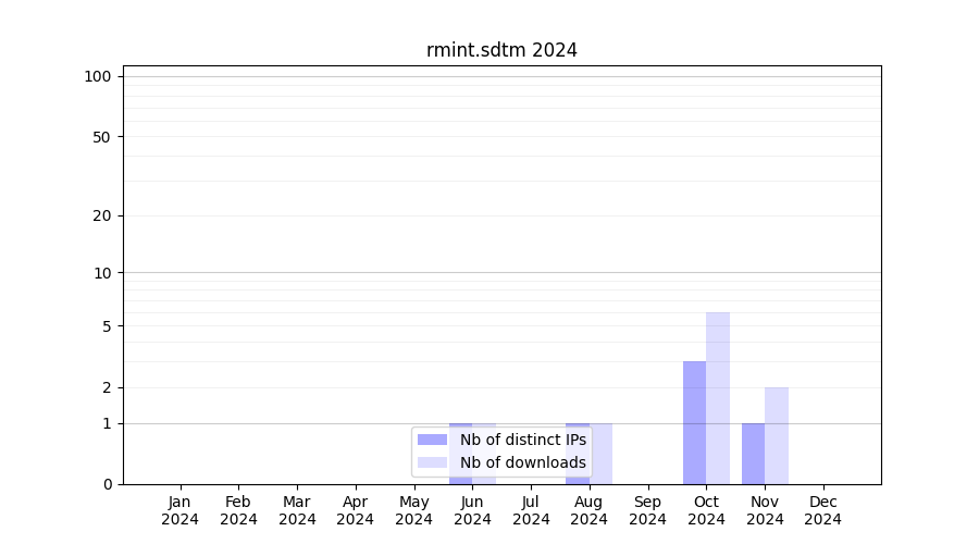 Number of downloads for annotation package rmint.sdtm, year by year, from 2025 back to 2014 (years with no downloads are omitted):