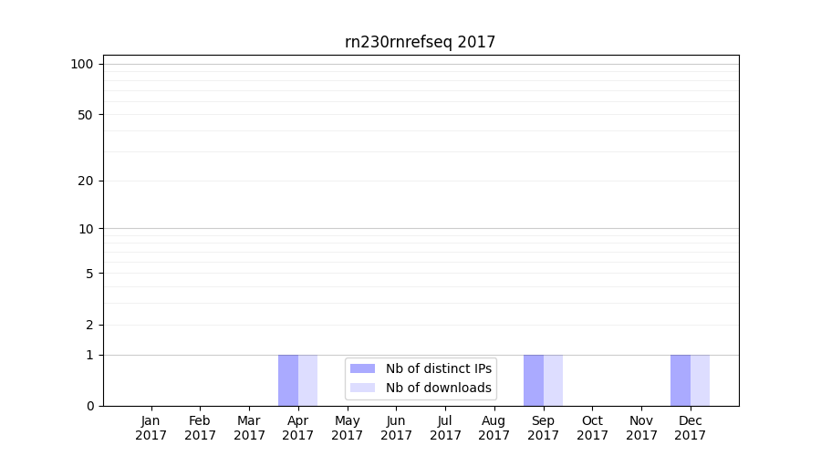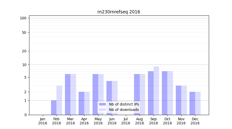 Number of downloads for annotation package rn230rnrefseq, year by year, from 2025 back to 2014 (years with no downloads are omitted):