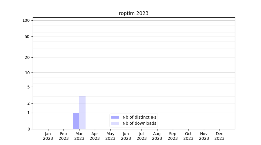 Number of downloads for annotation package roptim, year by year, from 2025 back to 2014 (years with no downloads are omitted):