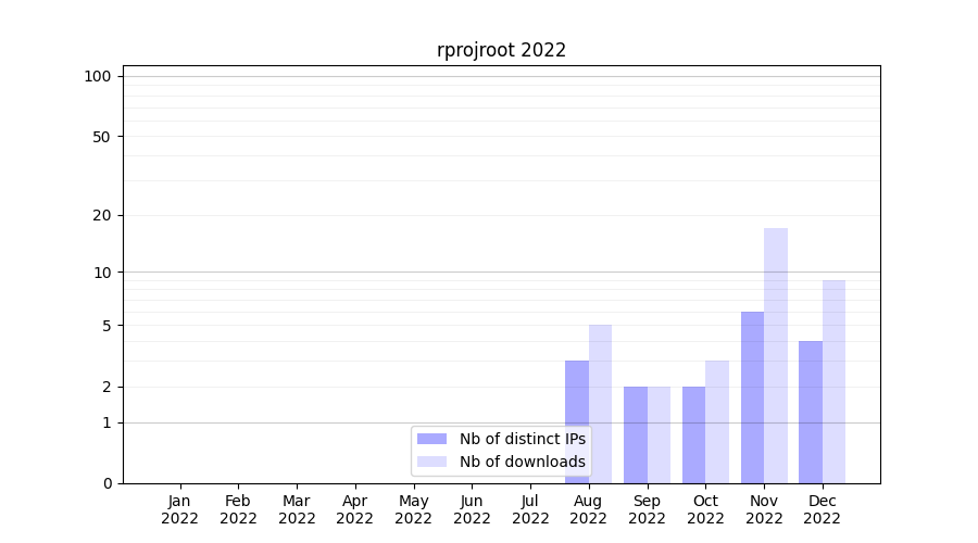 Number of downloads for annotation package rprojroot, year by year, from 2025 back to 2014 (years with no downloads are omitted):