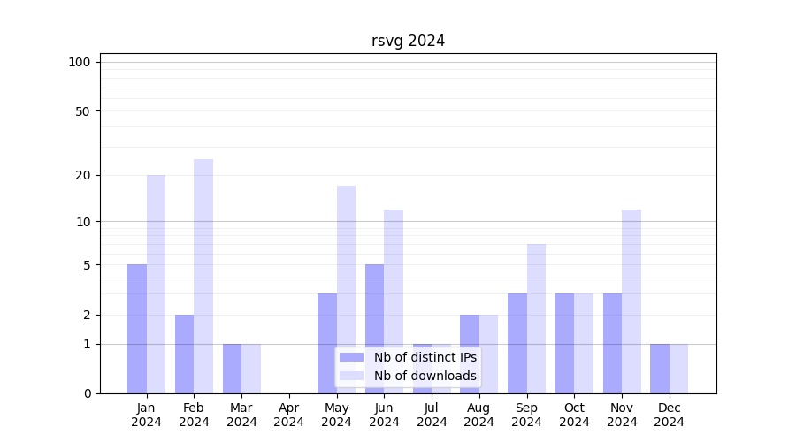 Number of downloads for annotation package rsvg, year by year, from 2025 back to 2014 (years with no downloads are omitted):