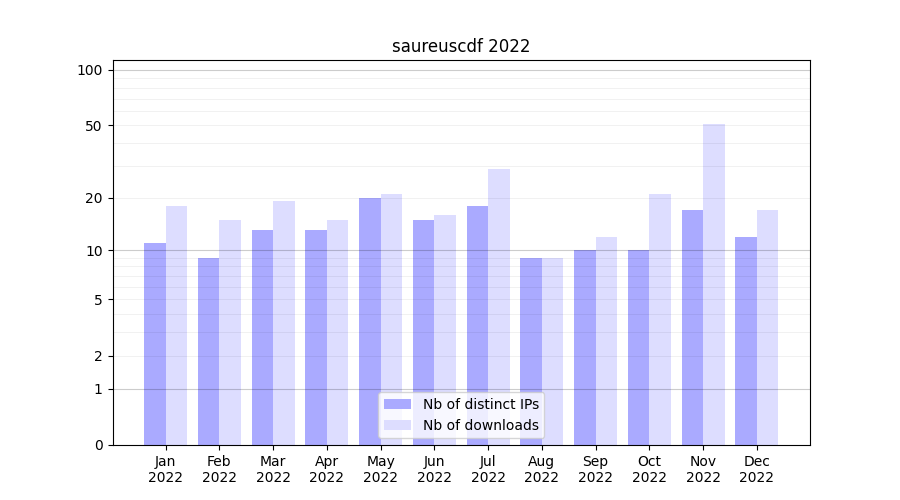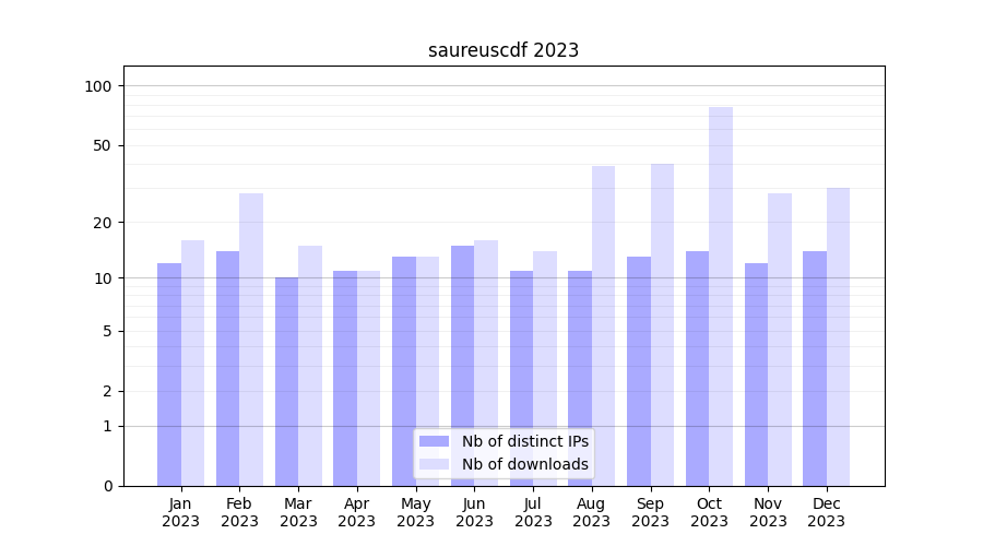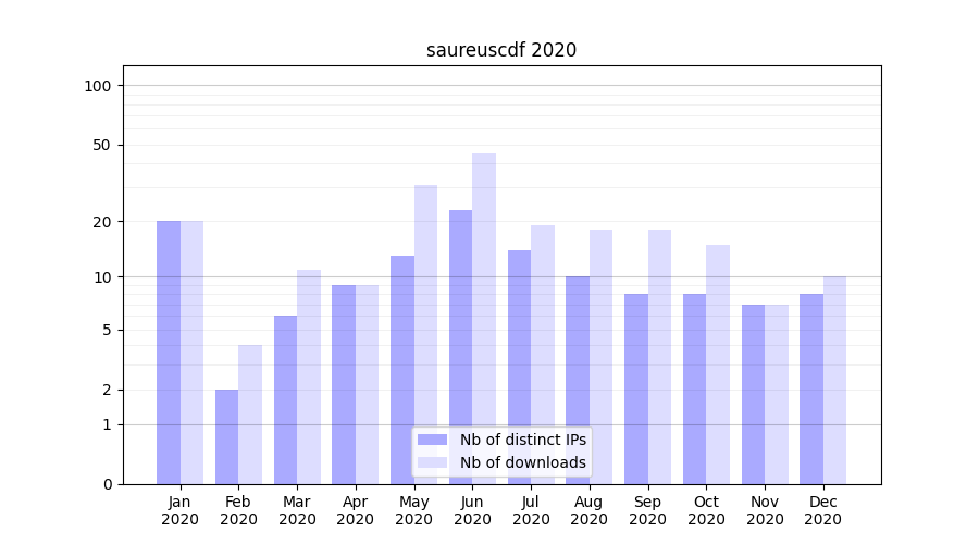 Number of downloads for annotation package saureuscdf, year by year, from 2025 back to 2014 (years with no downloads are omitted):