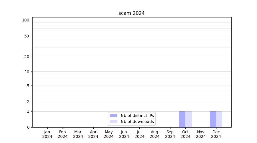 Number of downloads for annotation package scam, year by year, from 2025 back to 2014 (years with no downloads are omitted):