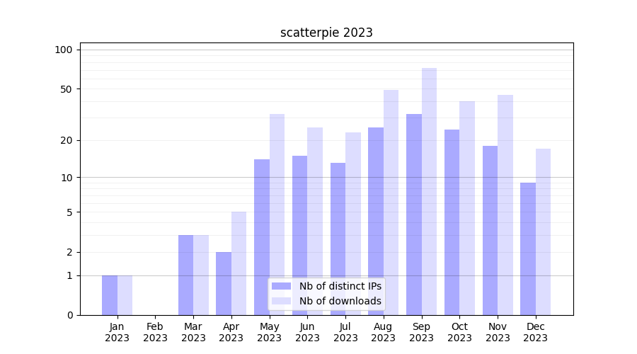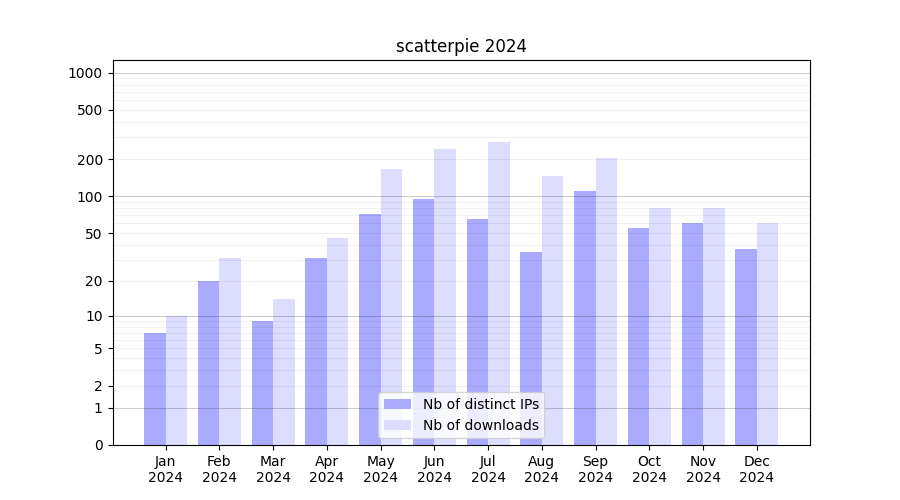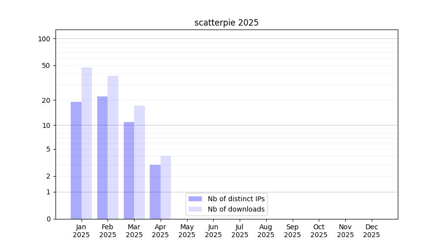 Number of downloads for annotation package scatterpie, year by year, from 2025 back to 2014 (years with no downloads are omitted):