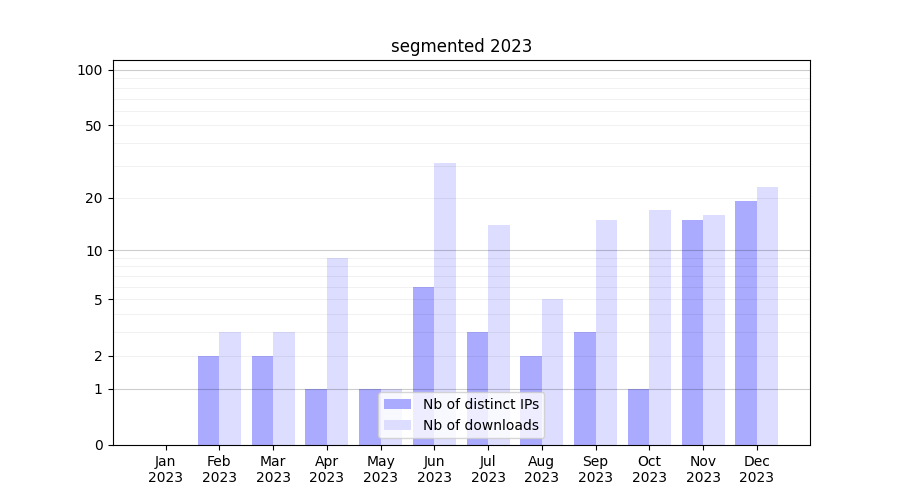 Number of downloads for annotation package segmented, year by year, from 2025 back to 2014 (years with no downloads are omitted):