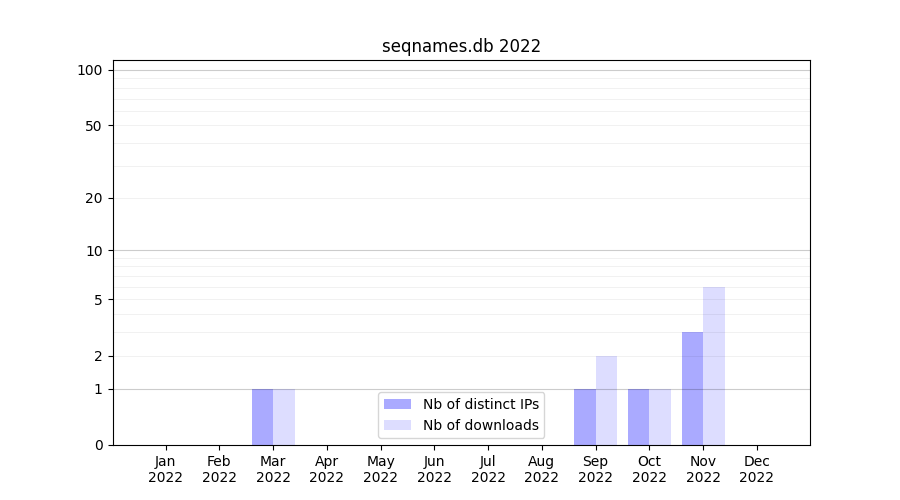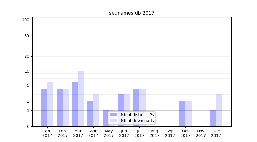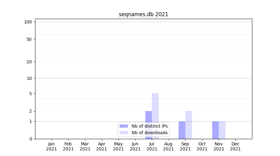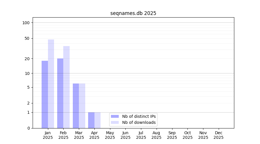 Number of downloads for annotation package seqnames.db, year by year, from 2025 back to 2014 (years with no downloads are omitted):