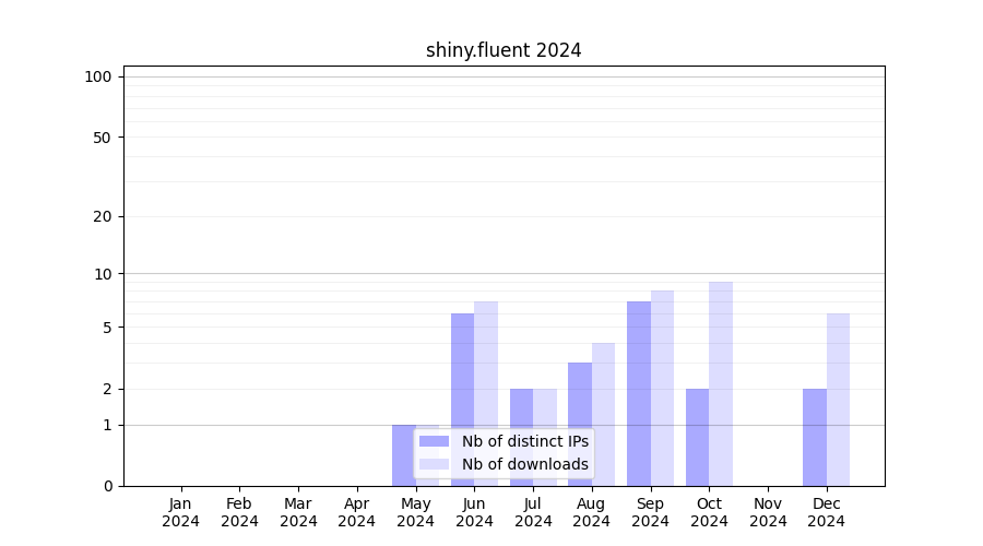 Number of downloads for annotation package shiny.fluent, year by year, from 2025 back to 2014 (years with no downloads are omitted):