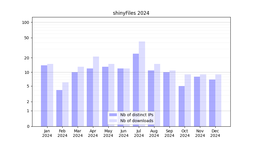 Number of downloads for annotation package shinyFiles, year by year, from 2025 back to 2014 (years with no downloads are omitted):