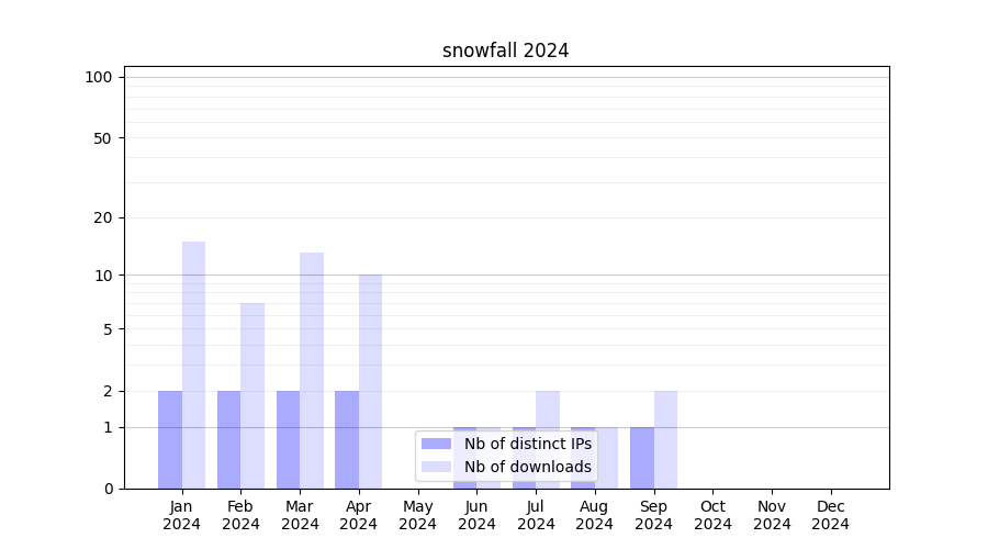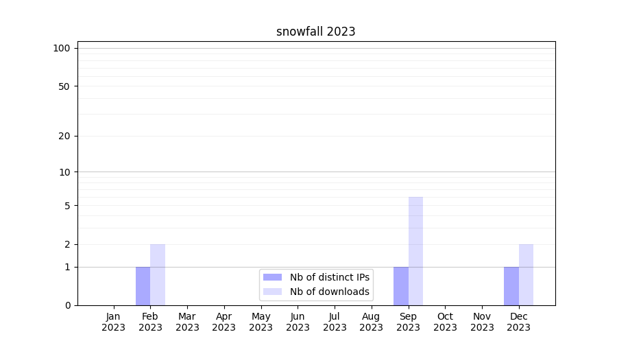 Number of downloads for annotation package snowfall, year by year, from 2025 back to 2014 (years with no downloads are omitted):