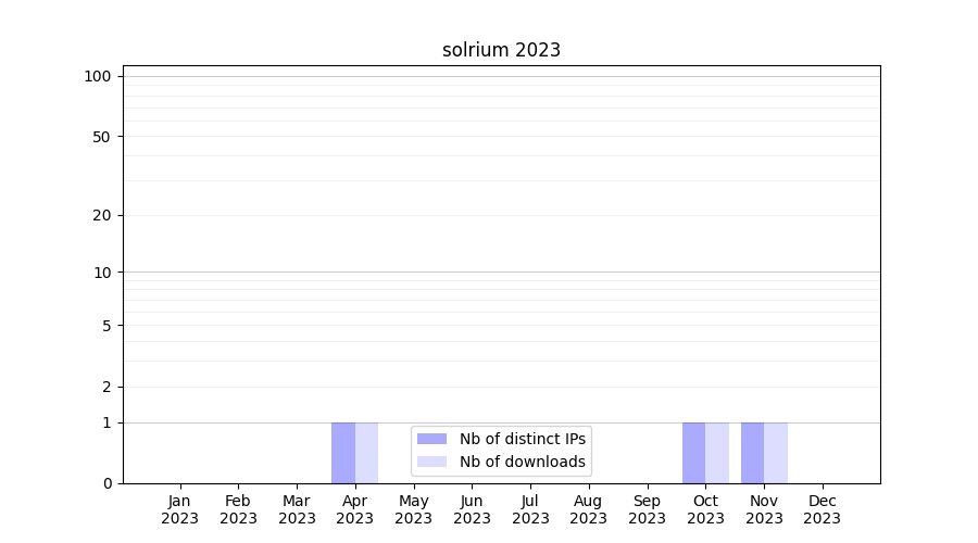 Number of downloads for annotation package solrium, year by year, from 2025 back to 2014 (years with no downloads are omitted):