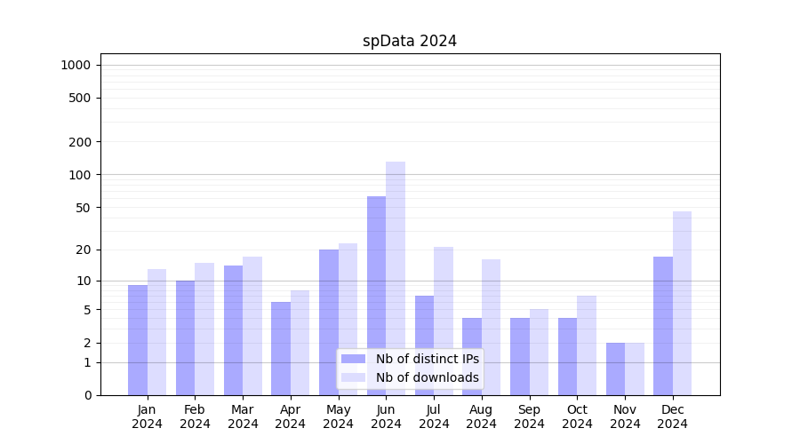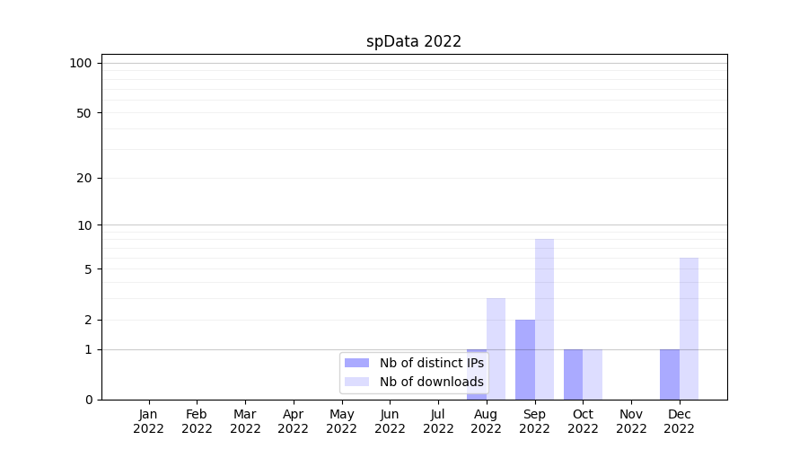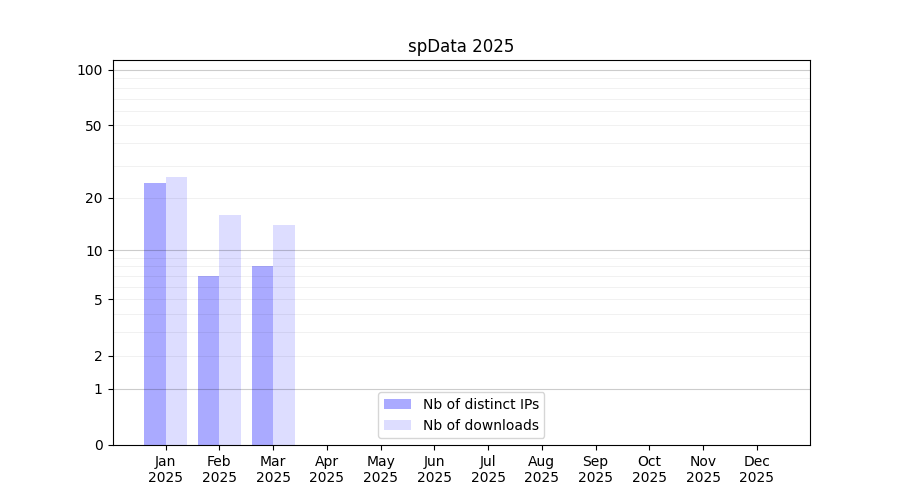 Number of downloads for annotation package spData, year by year, from 2025 back to 2014 (years with no downloads are omitted):