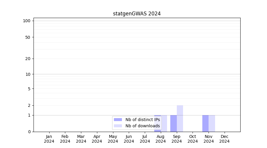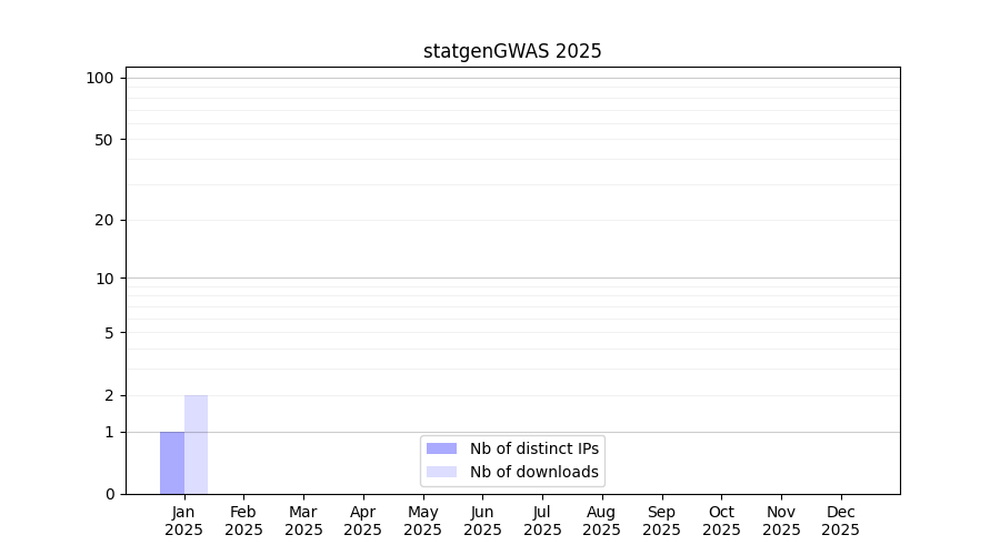 Number of downloads for annotation package statgenGWAS, year by year, from 2025 back to 2014 (years with no downloads are omitted):
