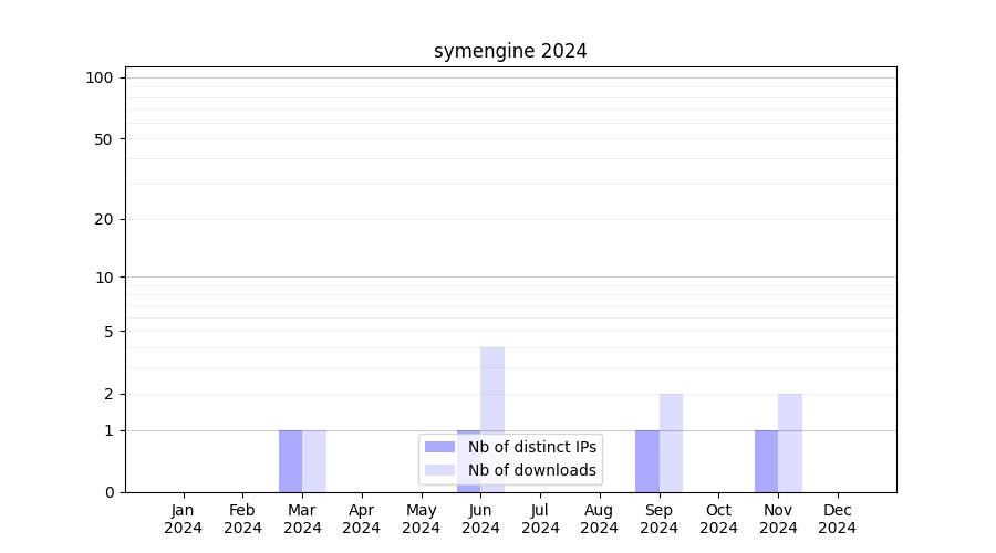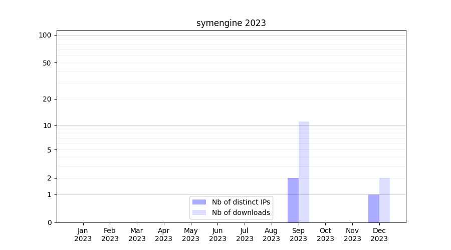 Number of downloads for annotation package symengine, year by year, from 2025 back to 2014 (years with no downloads are omitted):