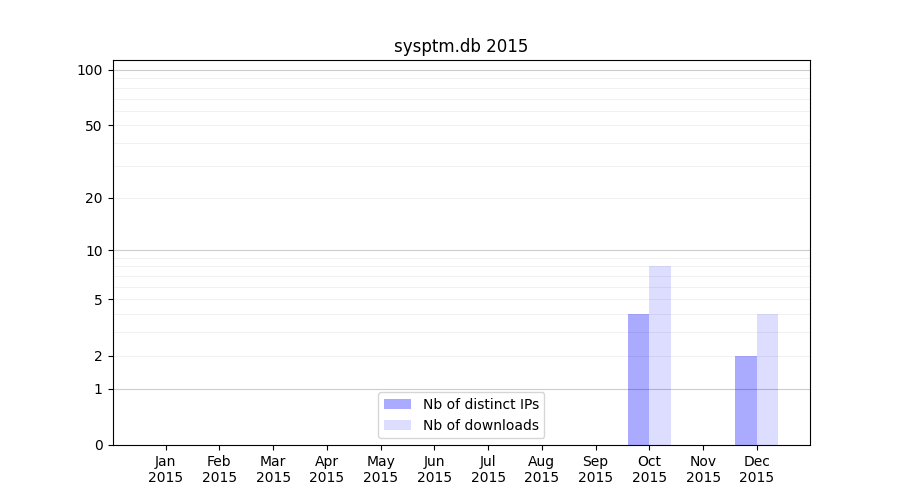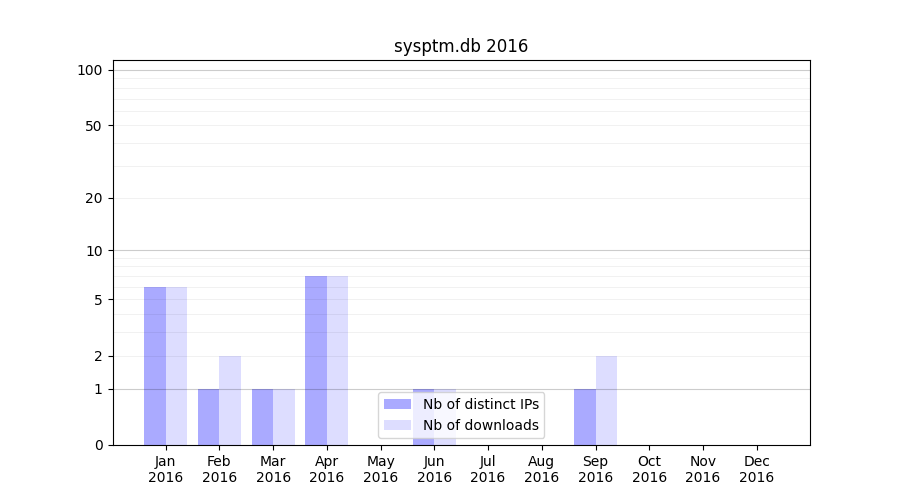 Number of downloads for annotation package sysptm.db, year by year, from 2025 back to 2014 (years with no downloads are omitted):