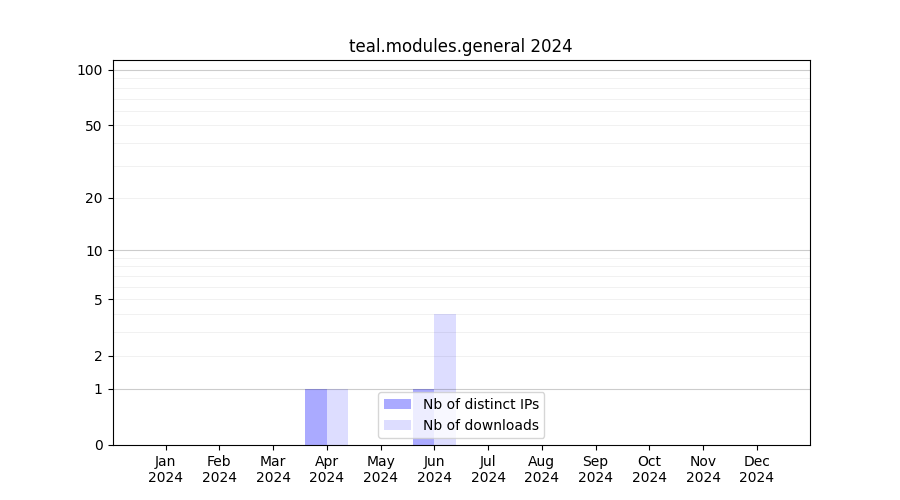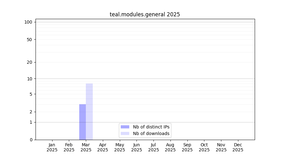 Number of downloads for annotation package teal.modules.general, year by year, from 2025 back to 2014 (years with no downloads are omitted):