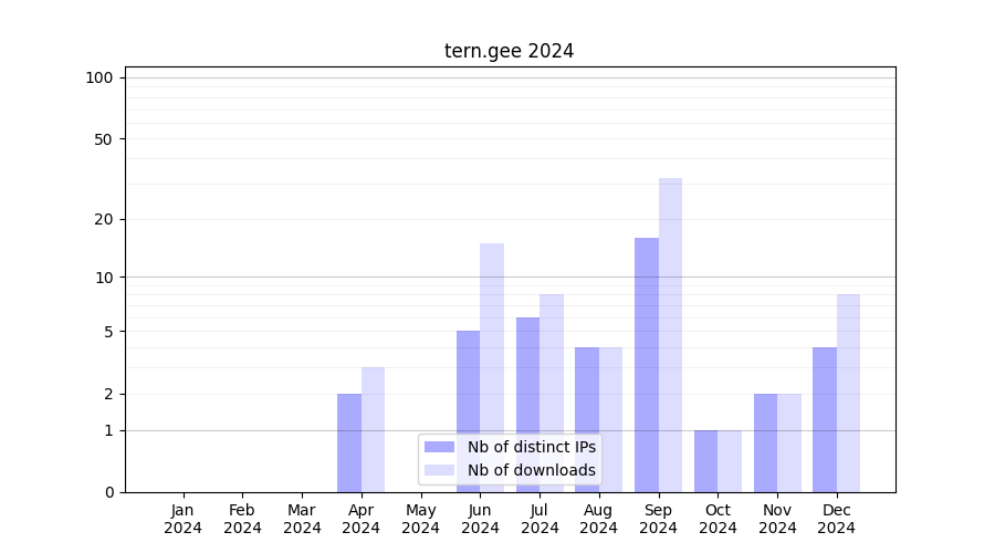 Number of downloads for annotation package tern.gee, year by year, from 2025 back to 2014 (years with no downloads are omitted):