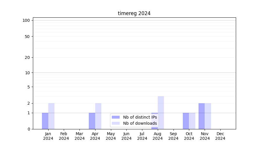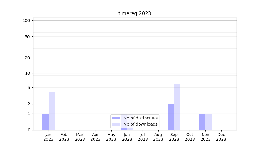 Number of downloads for annotation package timereg, year by year, from 2025 back to 2014 (years with no downloads are omitted):