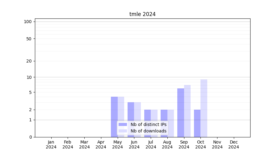 Number of downloads for annotation package tmle, year by year, from 2025 back to 2014 (years with no downloads are omitted):
