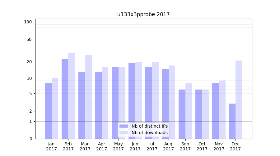 Number of downloads for annotation package u133x3pprobe, year by year, from 2025 back to 2014 (years with no downloads are omitted):