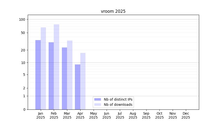 Number of downloads for annotation package vroom, year by year, from 2025 back to 2014 (years with no downloads are omitted):