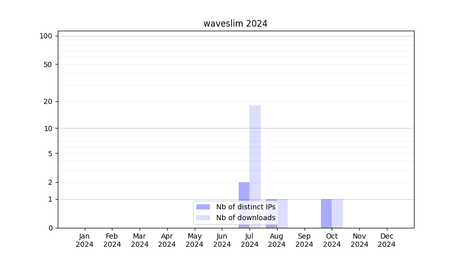 Number of downloads for annotation package waveslim, year by year, from 2025 back to 2014 (years with no downloads are omitted):