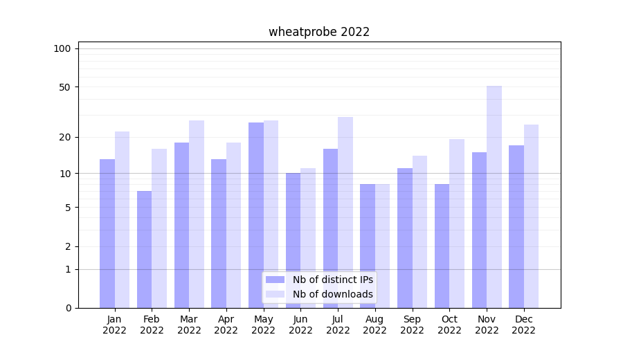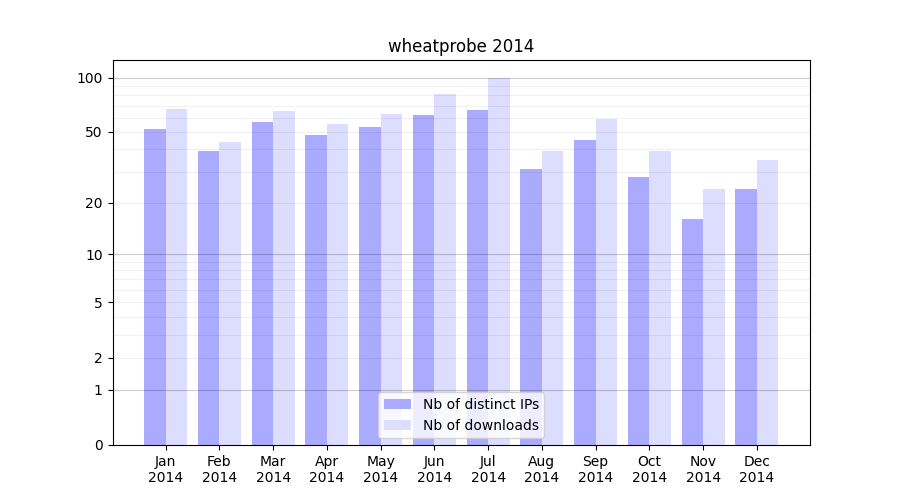 Number of downloads for annotation package wheatprobe, year by year, from 2025 back to 2014 (years with no downloads are omitted):