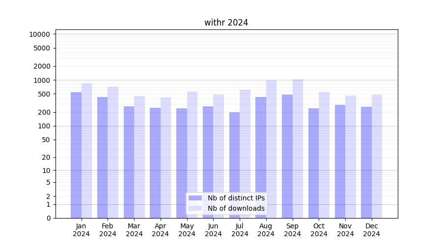 Number of downloads for annotation package withr, year by year, from 2025 back to 2014 (years with no downloads are omitted):