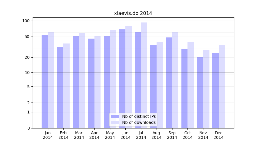 Number of downloads for annotation package xlaevis.db, year by year, from 2025 back to 2014 (years with no downloads are omitted):