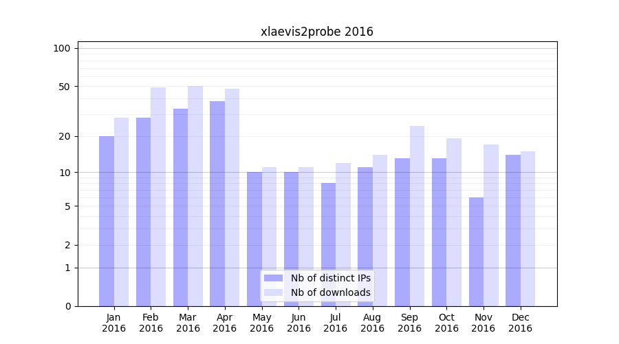Number of downloads for annotation package xlaevis2probe, year by year, from 2025 back to 2014 (years with no downloads are omitted):
