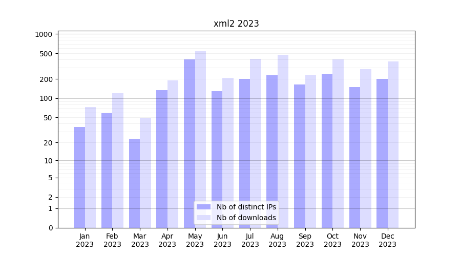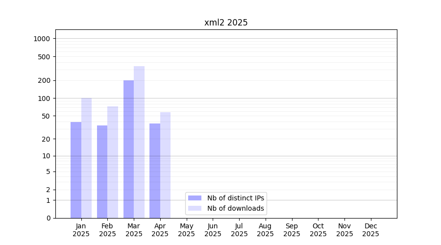 Number of downloads for annotation package xml2, year by year, from 2025 back to 2014 (years with no downloads are omitted):