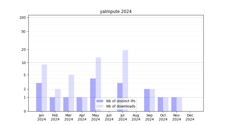 Number of downloads for annotation package yaImpute, year by year, from 2025 back to 2014 (years with no downloads are omitted):